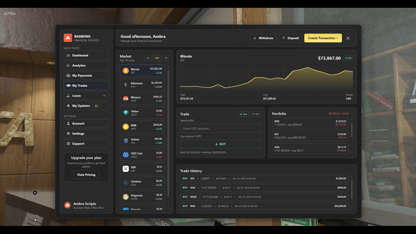 Integrated crypto trading module includes configurable coin list, buy and sell actions, portfolio view, and trade history.