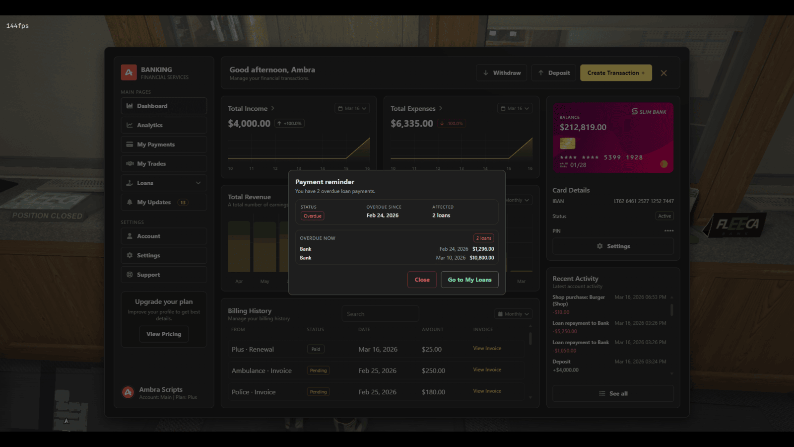 Advanced Banking System is a premium all-in-one FiveM banking script for ESX, QBCore, and Qbox with multi-account banking, invoices, society access, ATM PIN security, card management, subscriptions, loans, P2P lending, crypto trading, analytics, and live account activity in one polished financial platform.