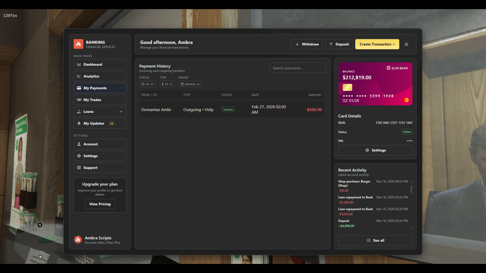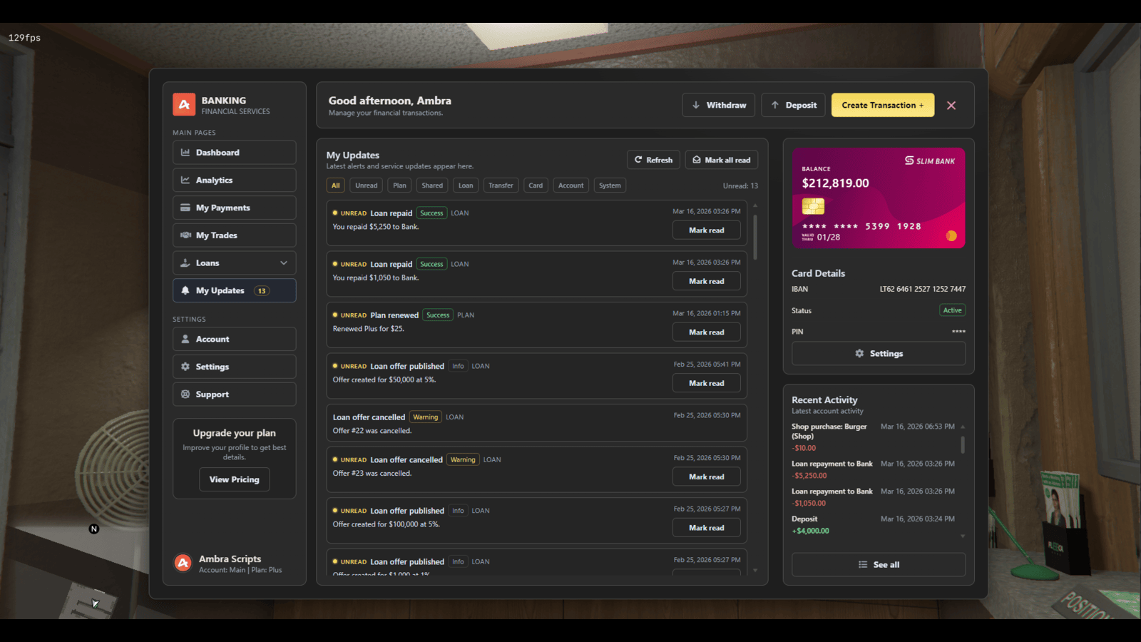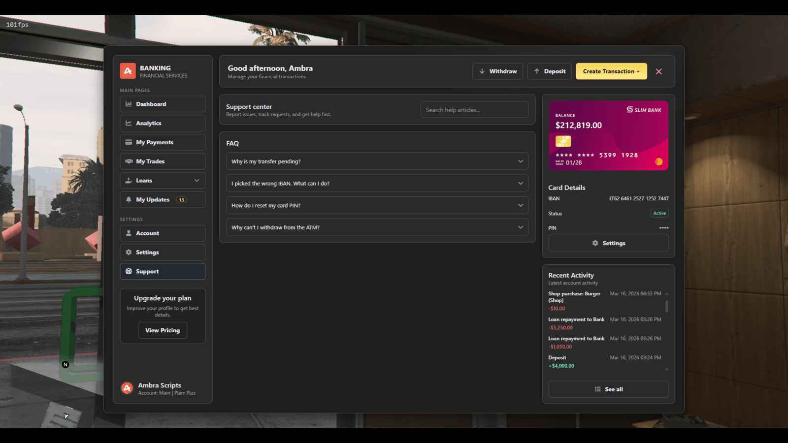 Advanced Banking System is a premium all-in-one FiveM banking script for ESX, QBCore, and Qbox with multi-account banking, invoices, society access, ATM PIN security, card management, subscriptions, loans, P2P lending, crypto trading, analytics, and live account activity in one polished financial platform.